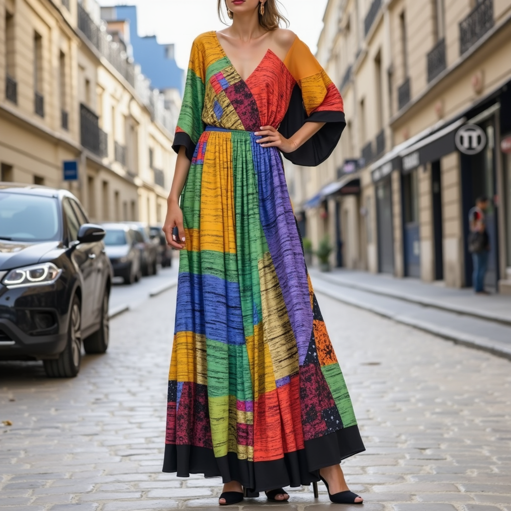 Apportez une touche d'art et de couleur à votre garde-robe avec cette superbe robe. Le design fluide et les motifs vibrants créent un look à la fois sophistiqué et ludique.